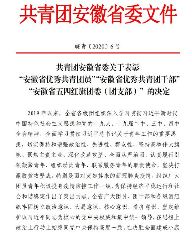 近日,共青团安徽省委下发了《共青团安徽省委关于表彰“全省优秀共青团员”“全省优秀共青团干部”“全省五四红旗团委(团支部)”的决定》(皖青[2020]6号),六合彩预测方法 2017级英语(师范)2班团支部荣获“安徽省五四红旗团(总)支部”荣誉称号。