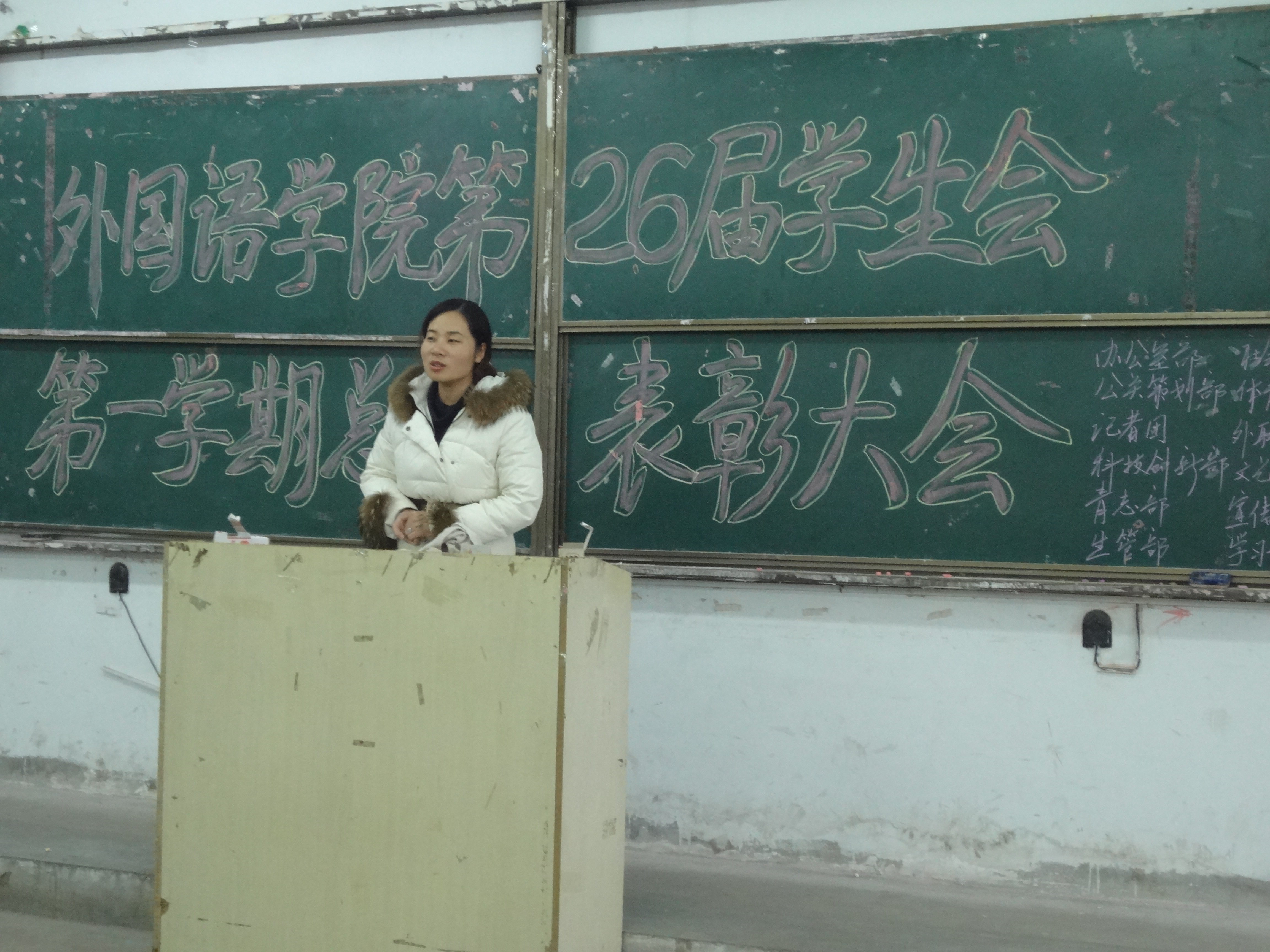 第二十六届学生会第一学期总结及表彰大会在新外一阶准时拉开帷幕。参加本次大会的有团总支张美丽老师和学生会全体成员。会议伊始由各部门代表,对本部门这一学期的工作进行总结。接着由张美丽老师发表了讲话,表达了对学生会成员的鼓励,并宣读了优秀干事和优秀副部的获奖名单,并且由主席团颁发奖品。最后由学生会主席张凯丽对整个学期的学生会工作做总结,并对下学期的工作进行展望。最终此次会议圆满结束。